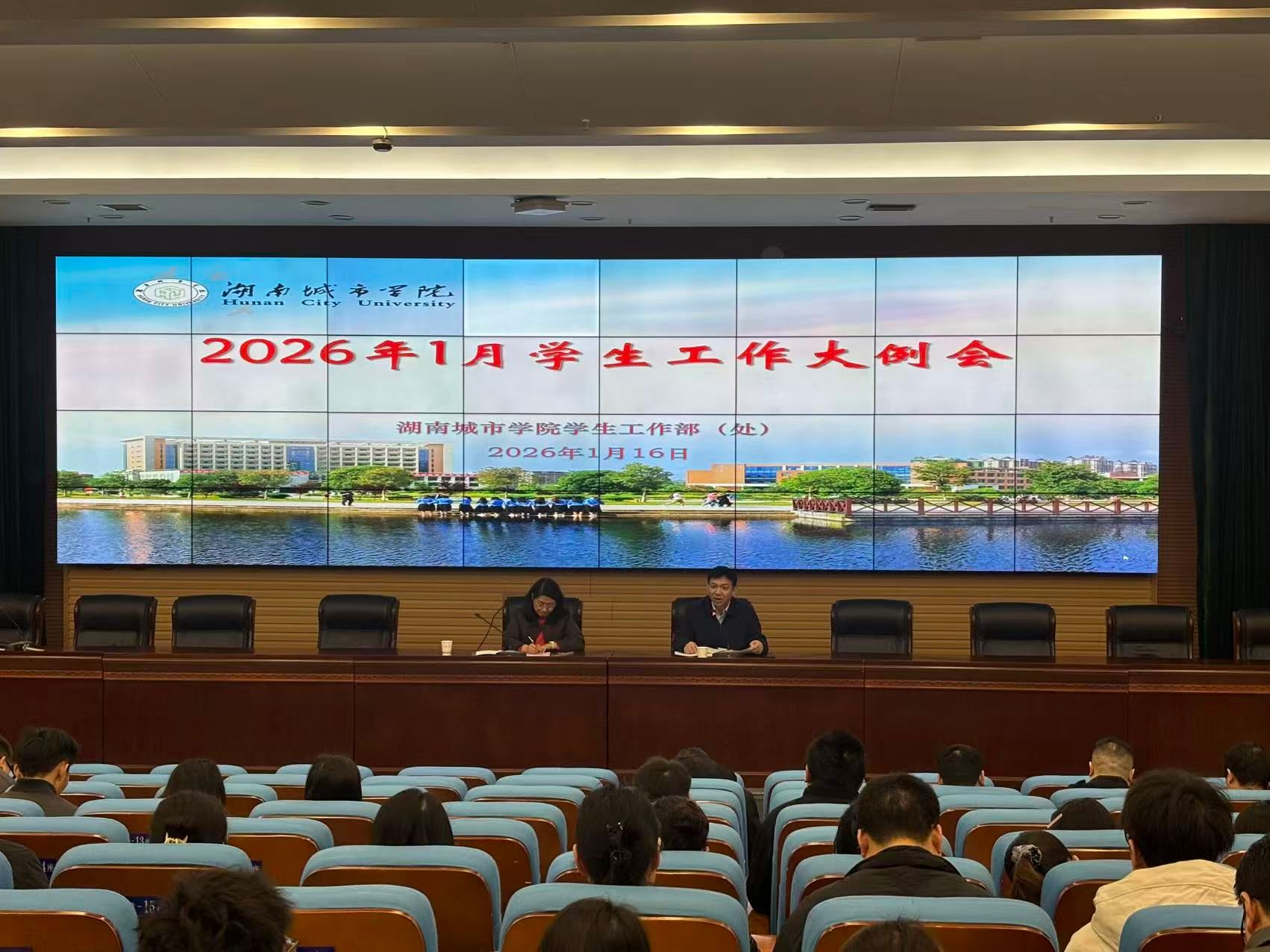 1月16日,2026年1月学生工作大例会在图书馆报告厅召开,会议就期末及寒假工作进行部署。副校长孙倩主持会议,学生工作部、保卫工作部、教务处相关负责人,各二级学院党委副书记及全体辅导员参加会议。